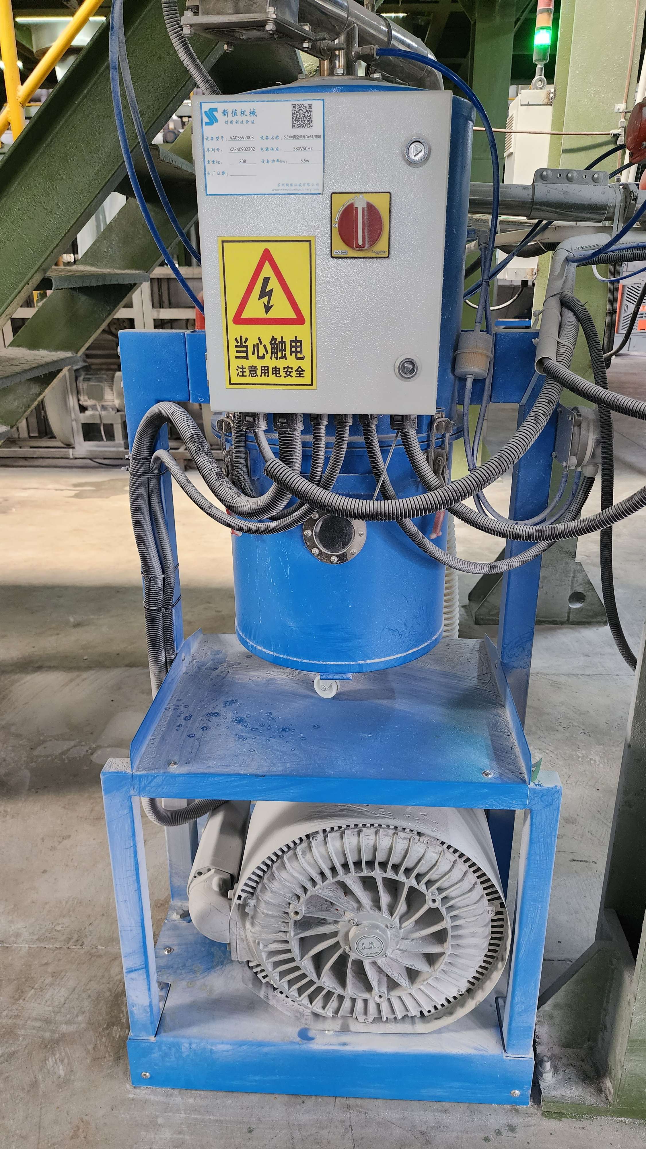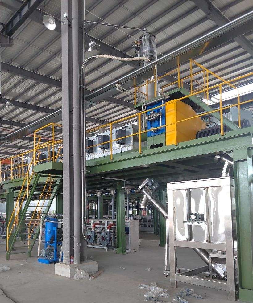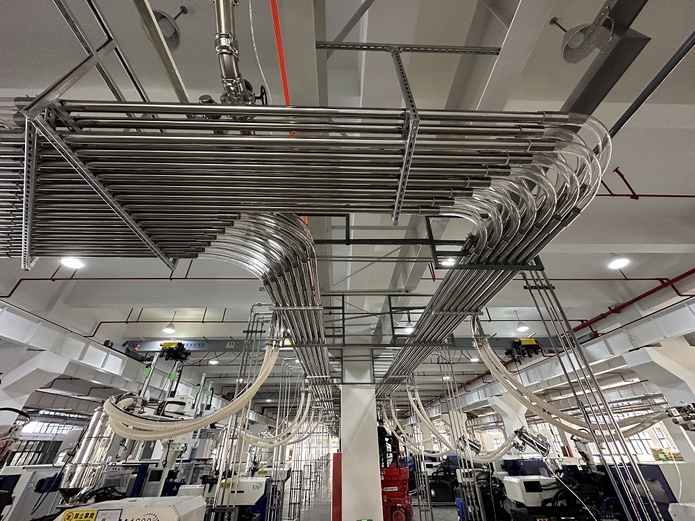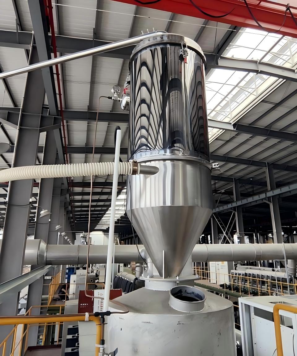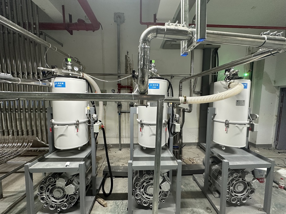 气力输送系统,通常由空压机、罗茨风机或者真空泵等提供动力,以空气或惰性气体为媒介,将固体散料(颗粒、粉末、破碎料等形态),通过连接的物料管道,以正压吹或负压吸的方式,从物料来源地:通常为储料仓,缓存料斗等,输送到物料目的地:通常为储料仓,打包机,成型机等。